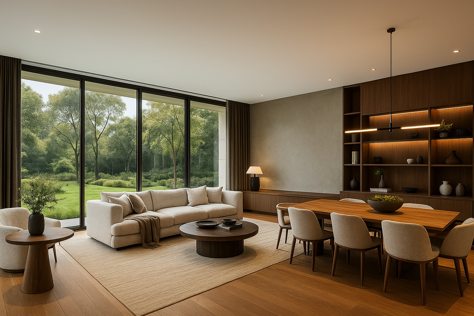 Experimente o luxo de conceito aberto com tetos altos, uma lareira contemporânea e janelas do chão ao teto oferecendo vistas deslumbrantes.